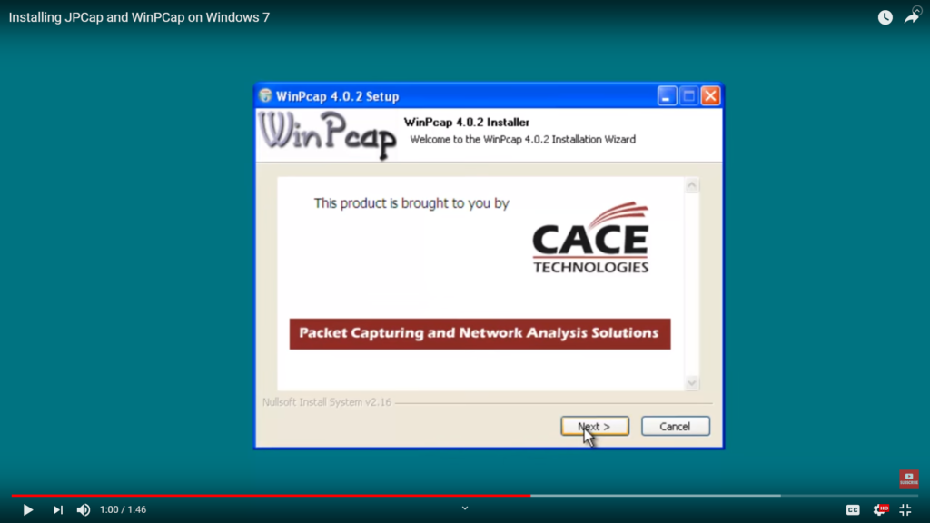 The video below demonstrates how to install JPCap and WinPCap on Windows 7.